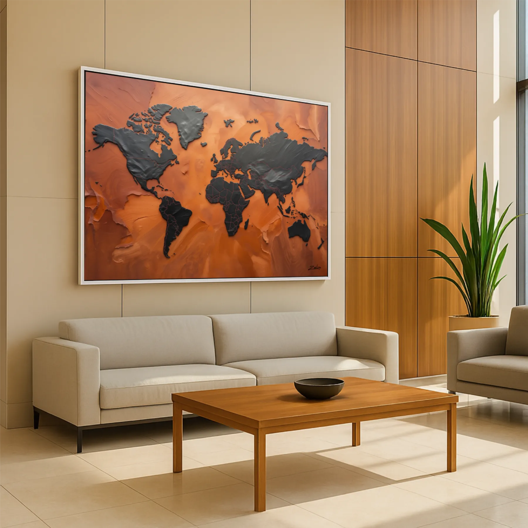 Vibrante e magnético, este quadro de Mapa Mundi transforma o olhar ao unir a intensidade do terracota com a profundidade do grafite metálico. O contraste entre as camadas cria uma presença marcante, que transforma o espaço em um ambiente de impacto e sofisticação.