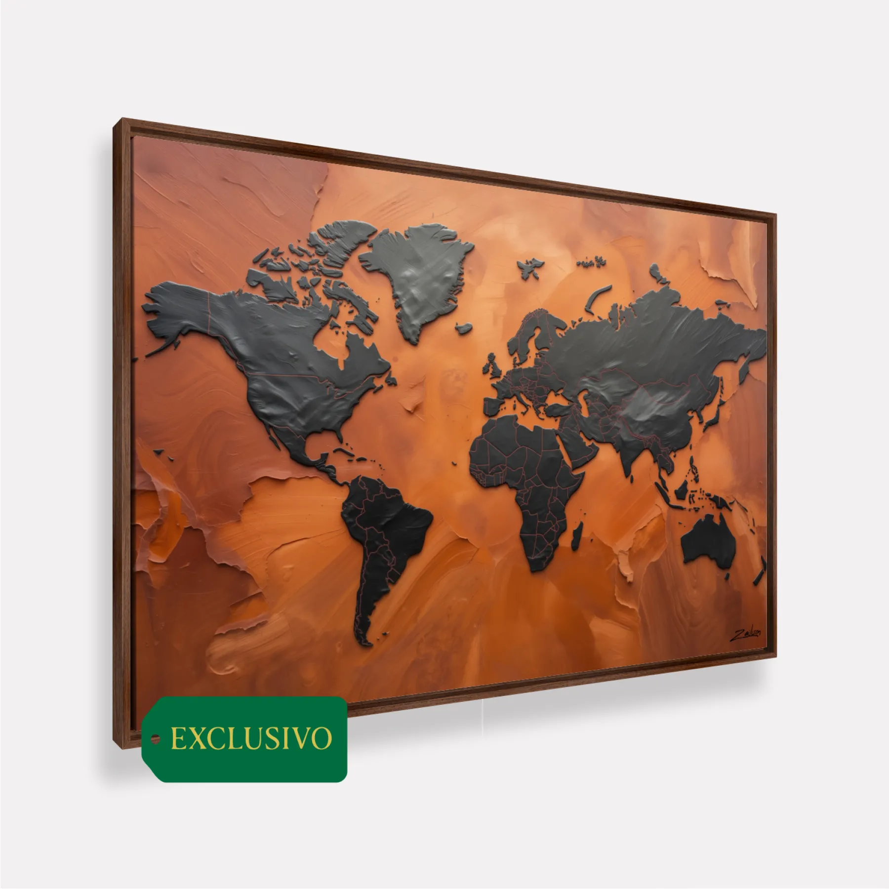 Quadro Mapa Mundi Terracota Vibrante & Grafite Metálico