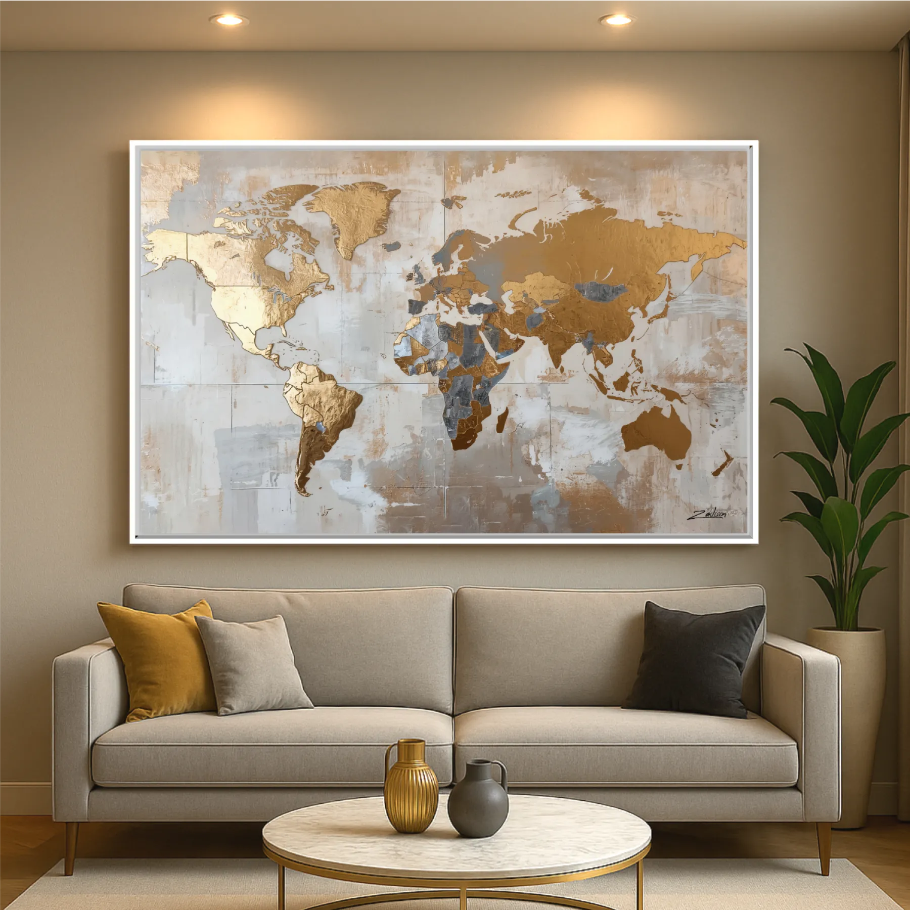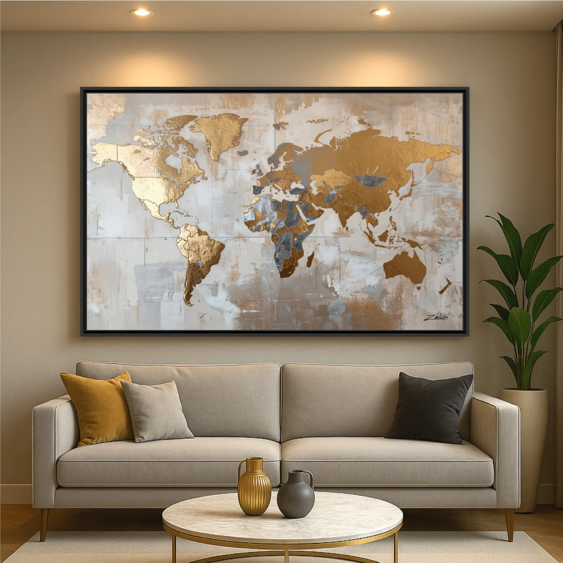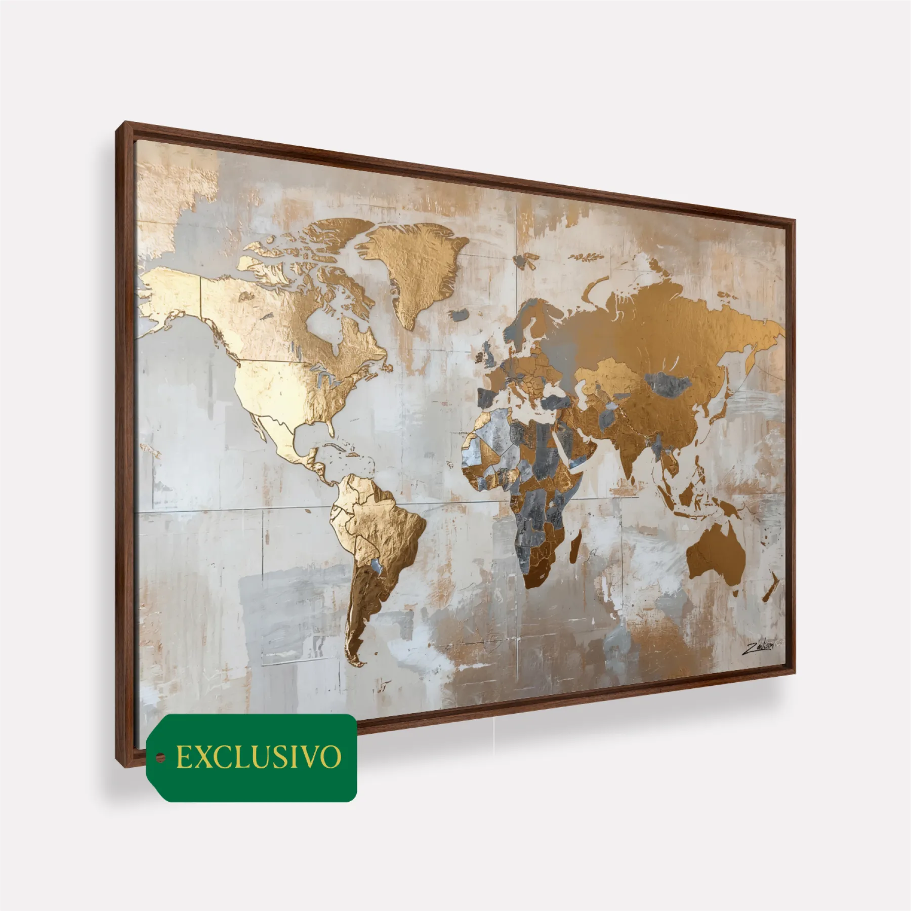 Um símbolo de sofisticação atemporal, este quadro de Mapa Mundi combina o brilho intenso do dourado com a elegância sutil do prata, criando uma composição luxuosa e singular. O relevo artístico destaca cada detalhe do mapa, trazendo profundidade e presença marcante.