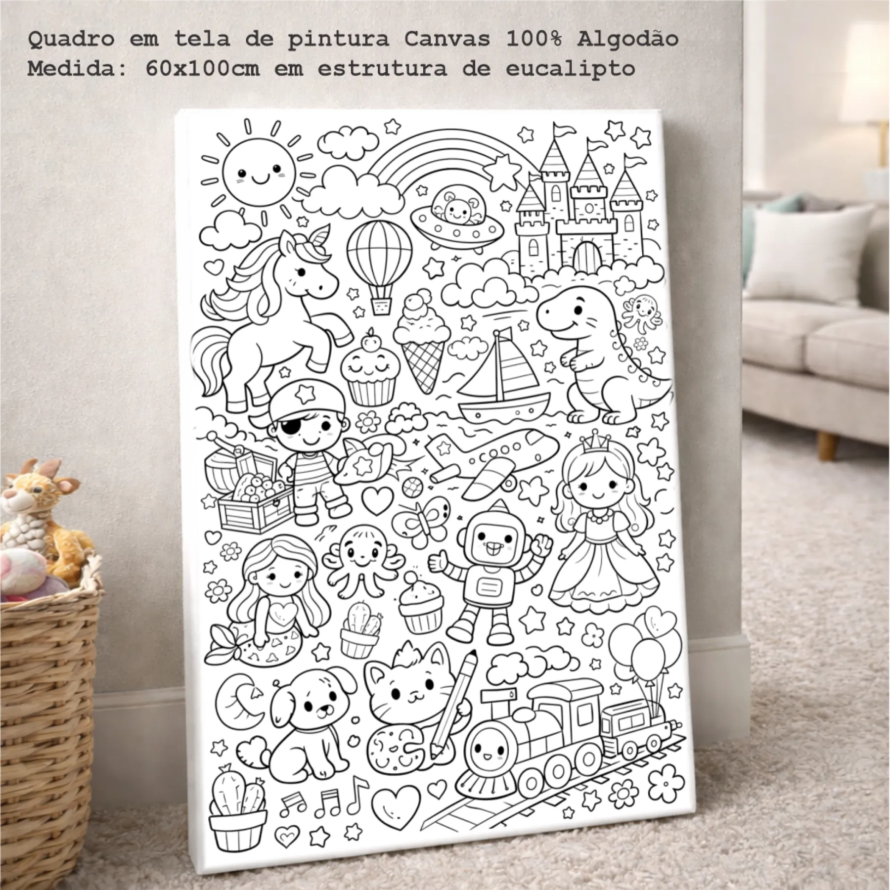 O quadro apresenta um universo encantador repleto de personagens e elementos divertidos, como unicórnio mágico, castelo encantado, dinossauro simpático, princesa, robô, trem, arco-íris, balão, animais fofos e muitos outros desenhos que convidam a criança a explorar sua criatividade enquanto pinta cada detalhe.