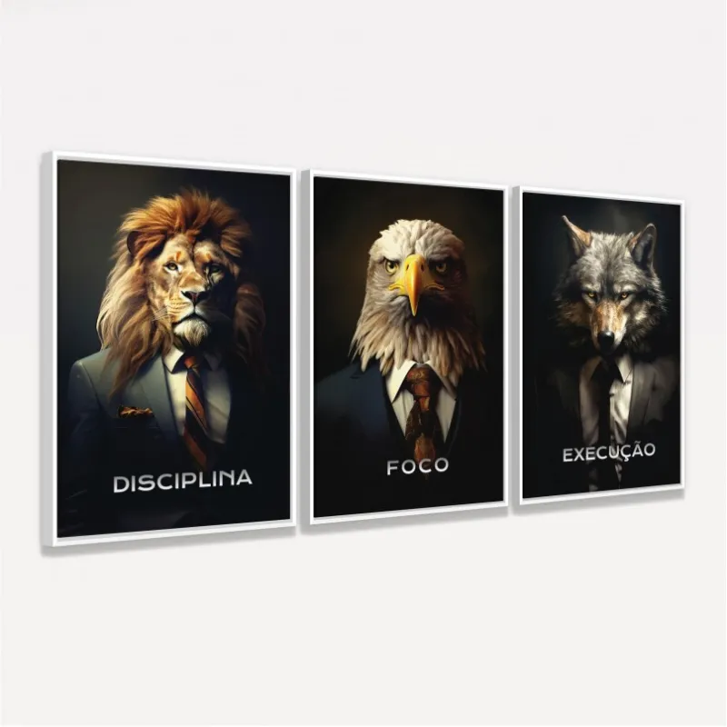 Uma verdadeira obra de motivação e liderança para ambientes que respiram performance. Esse trio de quadros traz representações poderosas de três pilares do sucesso: Disciplina (Leão), Foco (Águia) e Execução (Lobo). Cada animal veste terno e gravata, simbolizando o espírito empreendedor, a força da mentalidade estratégica e o instinto de ação necessário para vencer no mundo dos negócios.